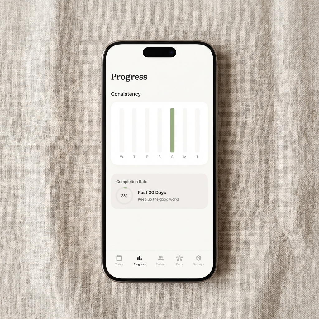 Don't go it alone. Pair up with an Accountability Partner or join a Pod. No aggressive leaderboards—just gentle cheers and nudges to keep you moving.